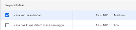 Anda tidak dapat memilih antara keyword ‘cara kuruskan badan’ dan ‘cara untuk kurus’ kerana kedua-dua mempunyai ‘Avg. monthly searches’ yang sama iaitu 1-10K.